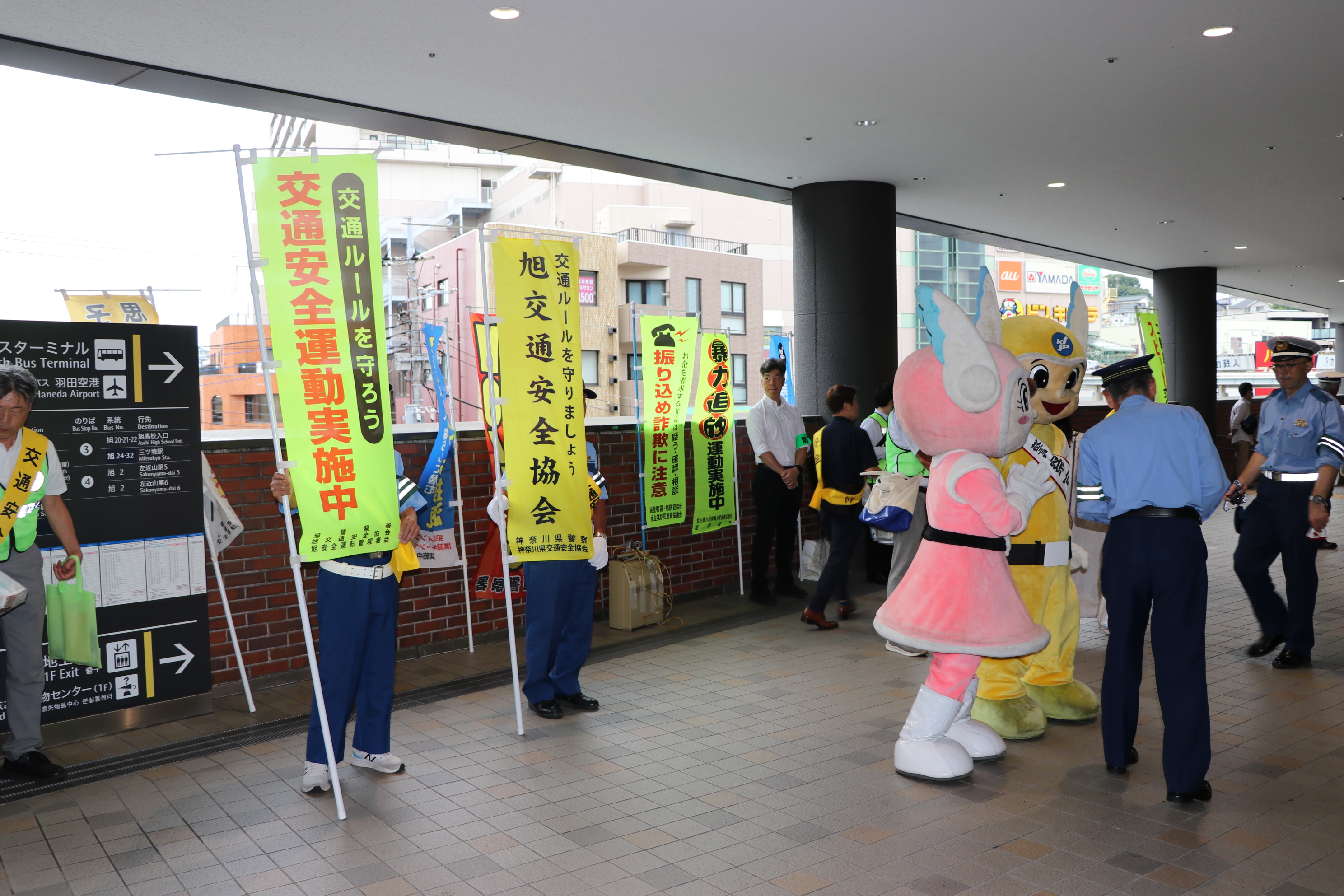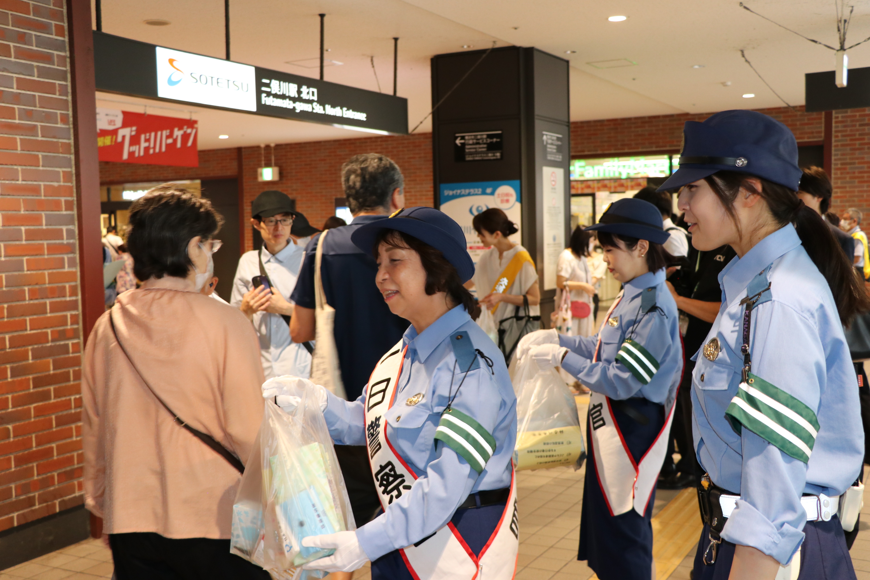 交通安全や特殊詐欺防止の呼びかけ、グッズの配布を行い